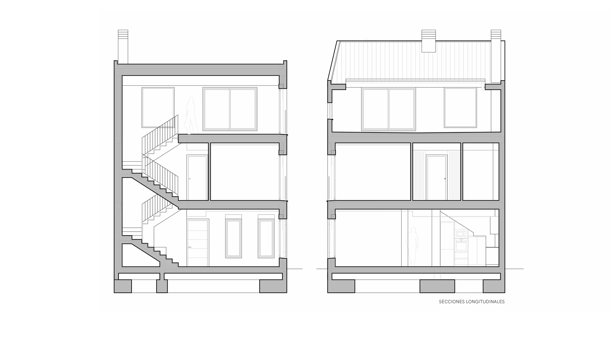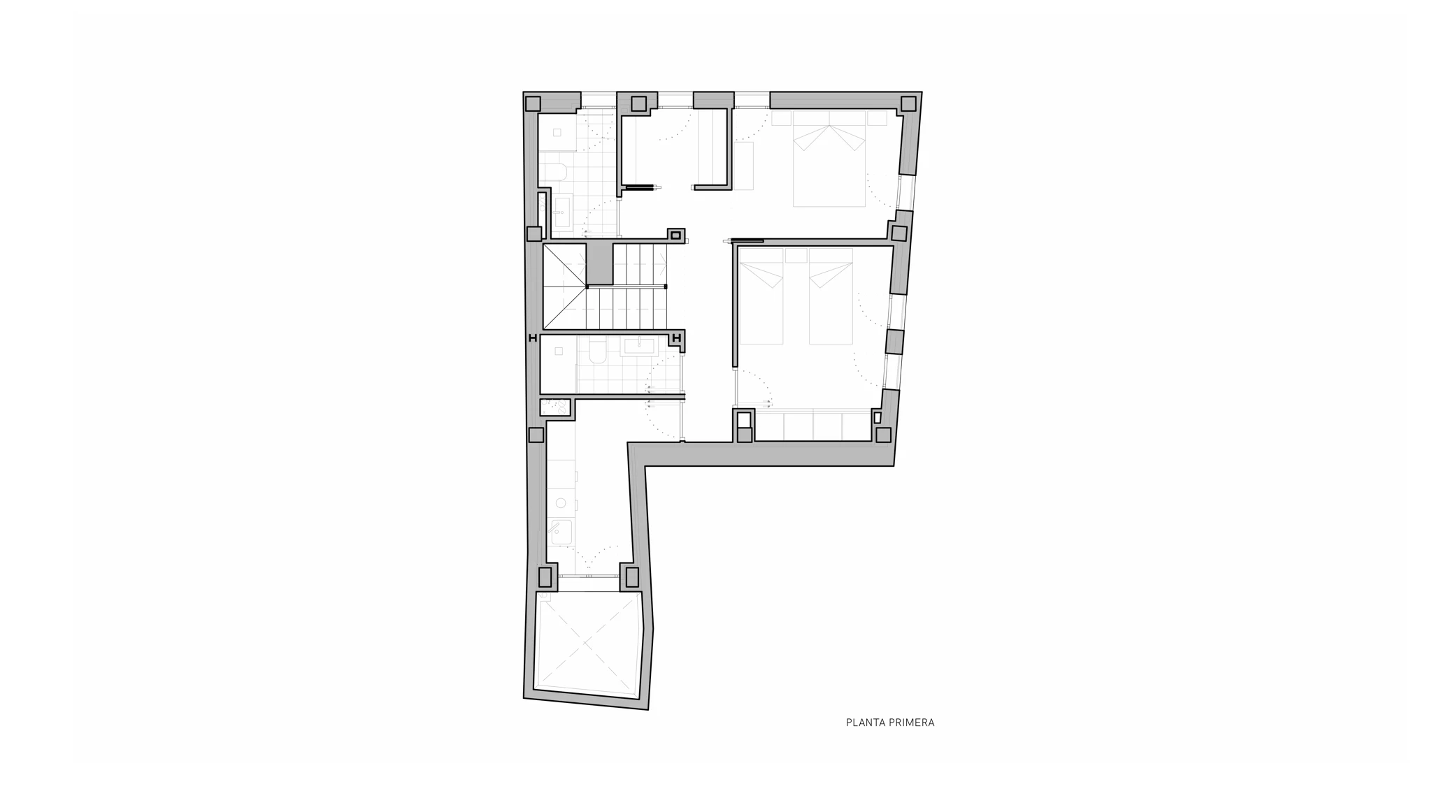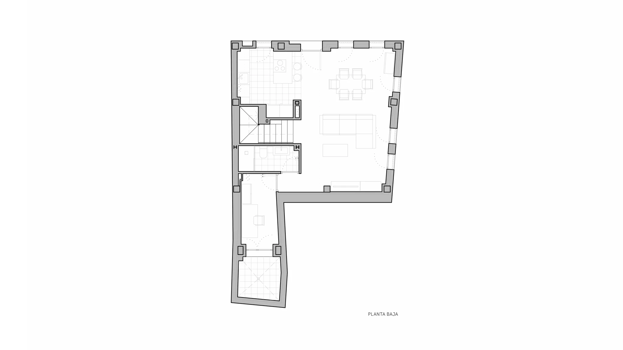 En el interior, la vivienda unifamiliar se desarrolla en tres plantas articulándose según las visuales que su ubicación privilegiada le confiere. Con una geometría en planta sensiblemente cuadrada a excepción de un saliente, sus condiciones sugieren la posibilidad de un patio interior situado al fondo de la vivienda, así como un gran espacio central abierto en la planta principal para favorecer el cruce de visuales entre el salón, comedor y cocina con las respectivas calles colindantes.