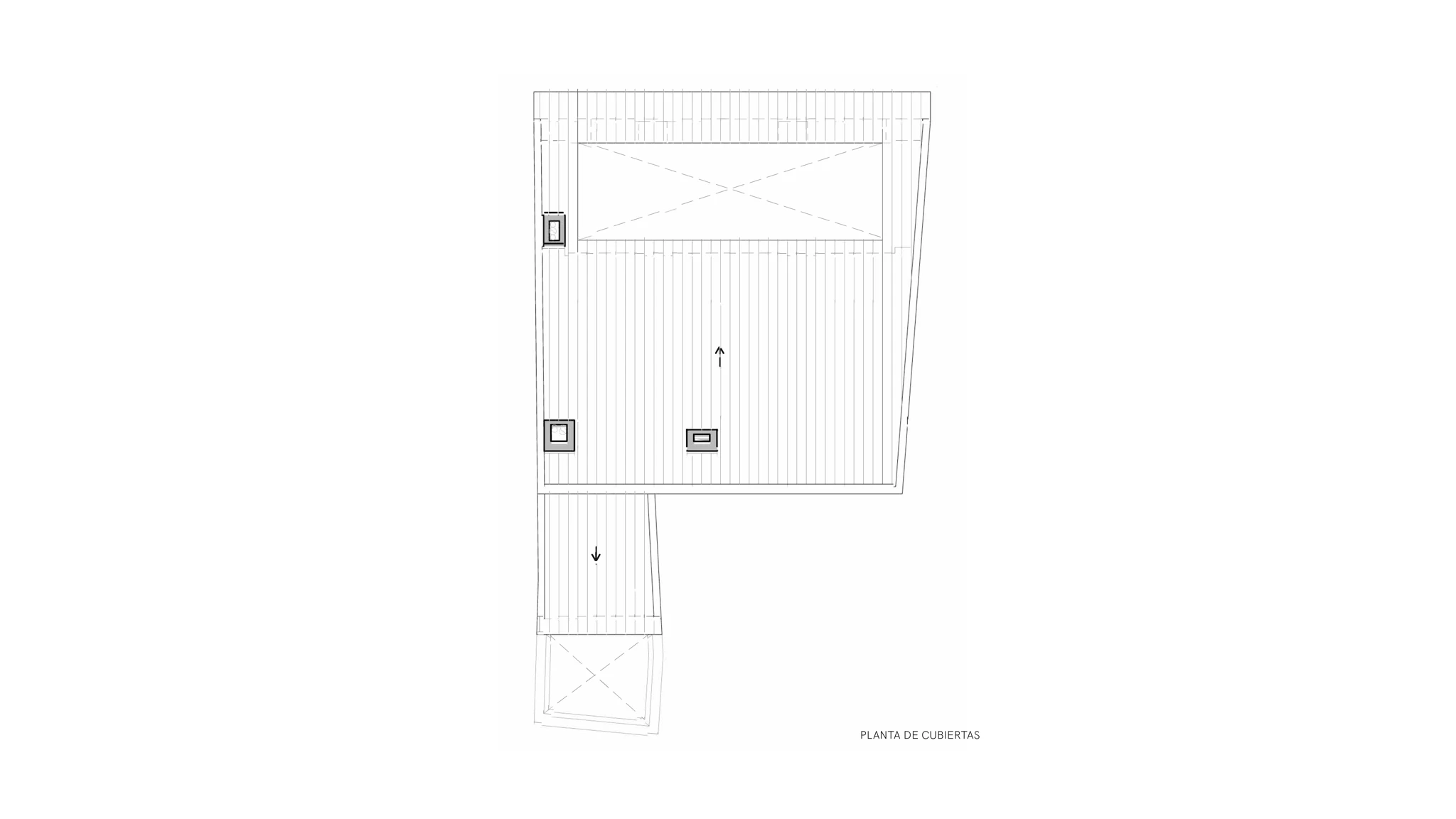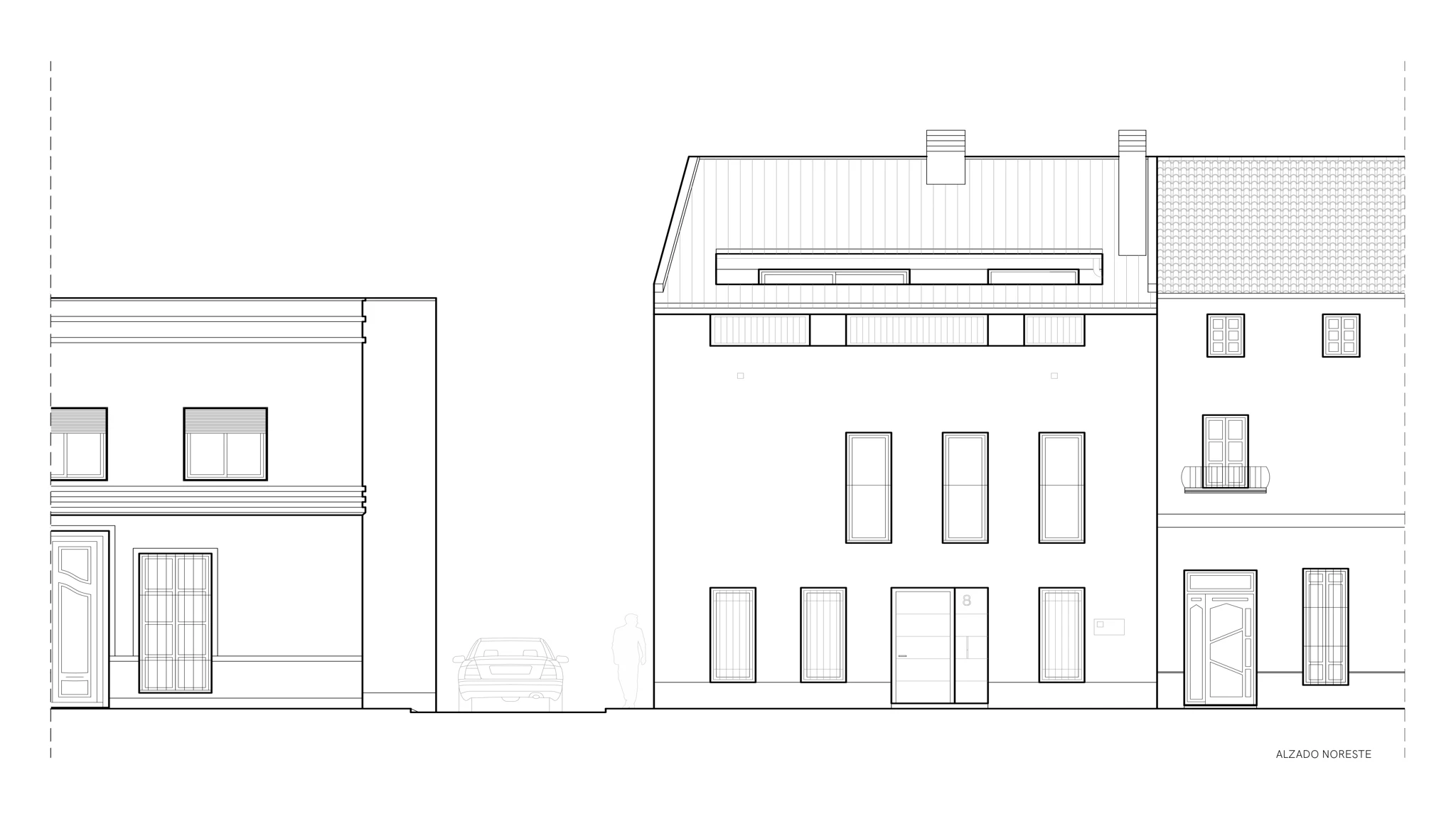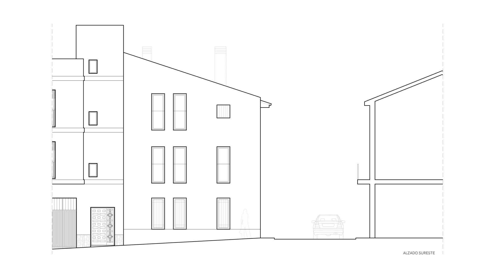 En el interior, la vivienda unifamiliar se desarrolla en tres plantas articulándose según las visuales que su ubicación privilegiada le confiere. Con una geometría en planta sensiblemente cuadrada a excepción de un saliente, sus condiciones sugieren la posibilidad de un patio interior situado al fondo de la vivienda, así como un gran espacio central abierto en la planta principal para favorecer el cruce de visuales entre el salón, comedor y cocina con las respectivas calles colindantes.