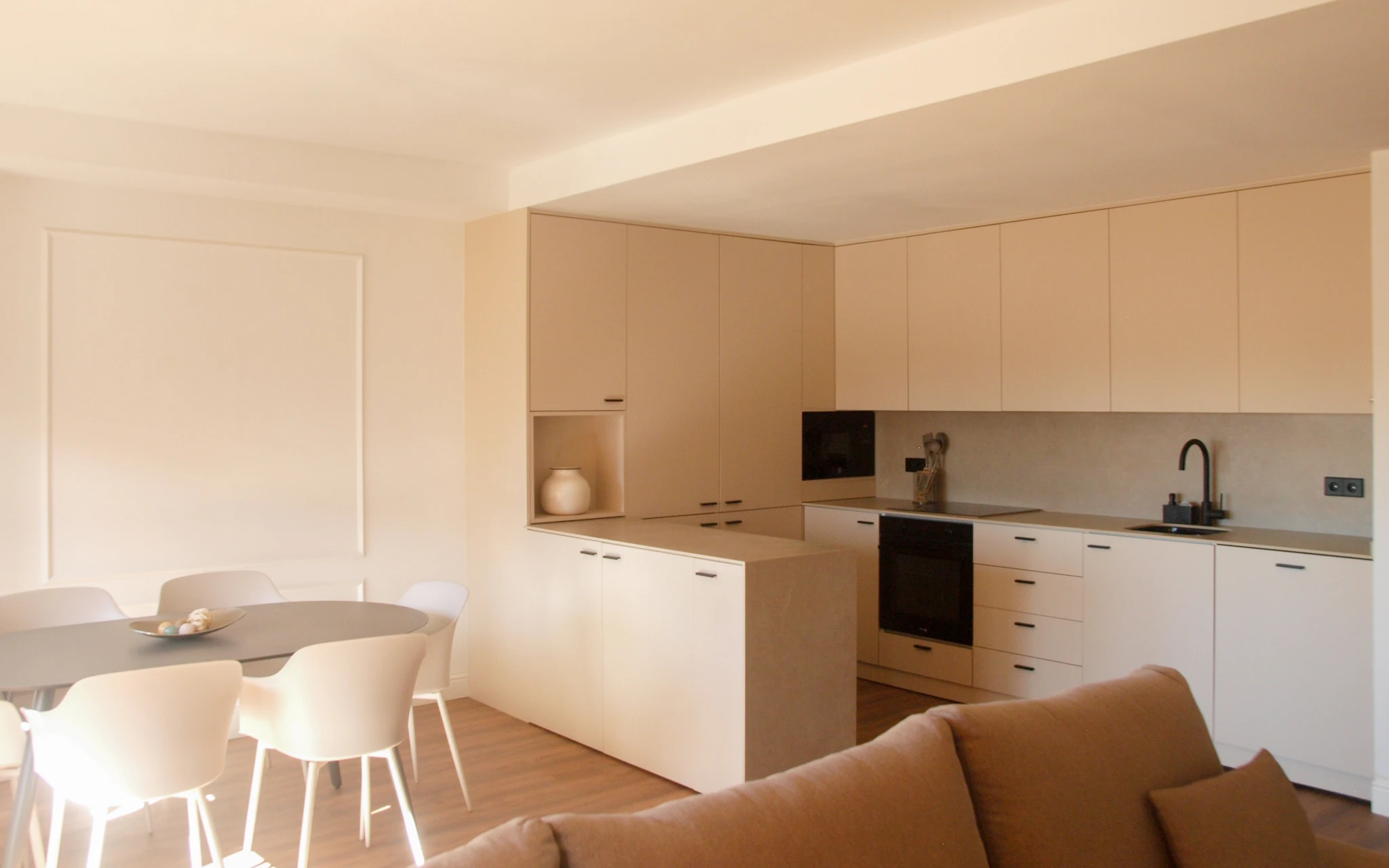 Todo su sistema distributivo gira en torno a una estancia centra abierta que incluye la cocina, el comedor y el salón, con muebles de diseño en tonos beige que confieren la calidez vanguardista que el proyecto así requería.